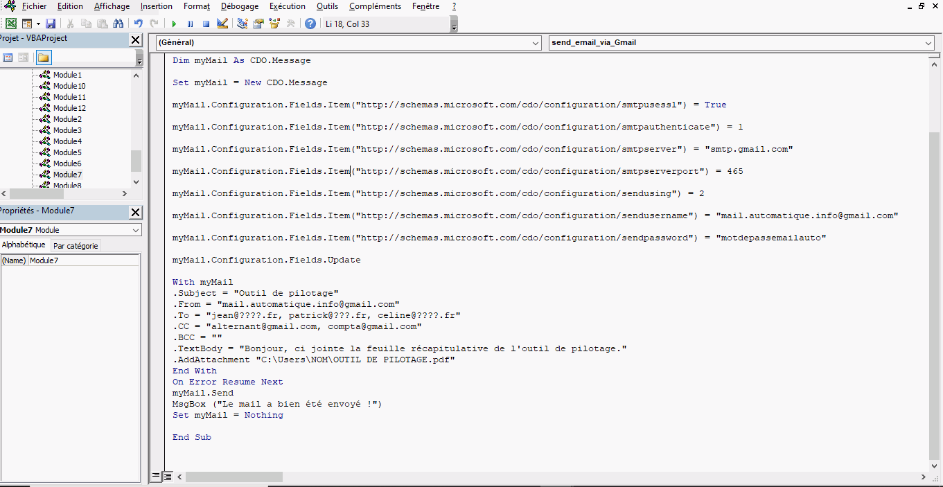 Pour info, je me suis connecté sur l'adresse mail en question et, je n'ai pas de mail envoyé depuis la date du problème. Je vous envoie la macro