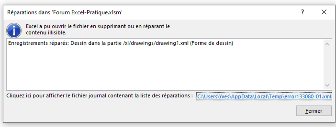 Depuis peu, une fois sur 4, j'ai un message d'erreur à l'ouverture. Je dois alors copier le nouveau ''Fichier réparé'' - créé automatiquement - sous un autre nom.
