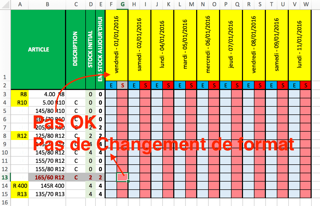 La difficulté c'est que j'ai en ligne 1 une colonne fusionnée sur 2 colonnes pour la date (F avec G par exemple...). Lorsque l'utilisateur clique sur une ligne quelconque de la colonne G par exemple (voir image) le format change uniquement pour la cellule G2 et pas pour la cellule G1 car elle est fusionnée avec F1... J'ai réussi toutes ces fonctionnalités avec de la mise en forme conditionnelle, mais je n'ai pas réussi à faire cette dernière fonction.