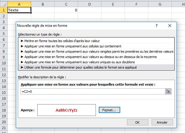 Je souhaite que si la cellule C2 est égale à zéro, le texte de la cellule A2 soit gras rouge.