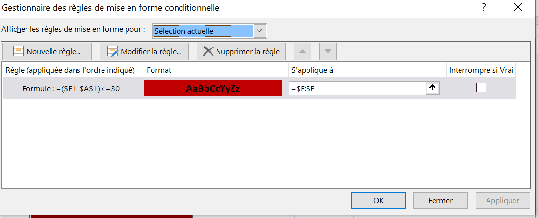 1) Mise en forme conditionnelle / Gerer les règles / S'applique à : $E$2:$E$4