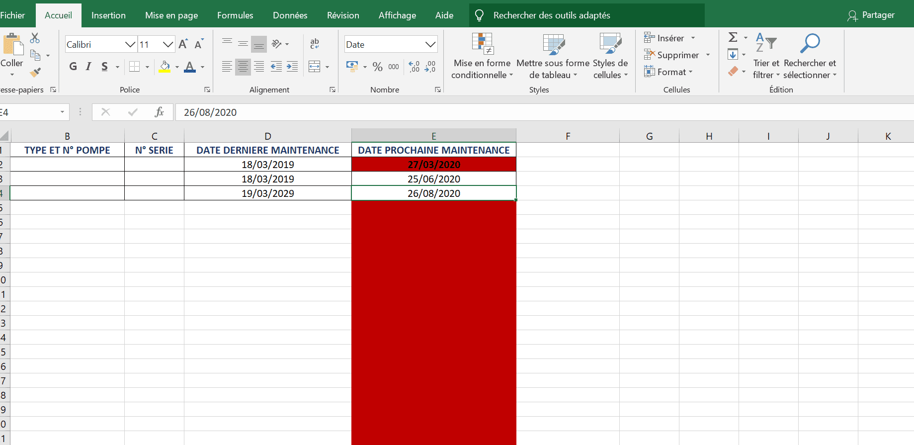 Pour faire court, j'ai mis une mise en forme conditionnelle, en gros on doit me prévenir ( surligner en rouge) quand il me reste plus qu'un mois pour faire la maintenance. J'ai trouver le calcul mais je ne comprends pas pourquoi le reste en bas reste en rouge( cf photo. Si quelqu'un à une solution svp