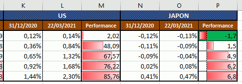 Mise en forme conditionnelle avec barre de donnéesLe 22/03/2021 à 13:49AAssurances.TMembre habituéMessages77ExcelFR Microsoft 365Inscrit04/03/2021 Bonjour,j'aimerai obtenir une mise en forme conditionnelle avec les barres de données, quand ma performance est supérieure à 0 que ma barre de donnée soit rouge et si c'est inferieur à 0 qu'elle soit verte est ce possible ? 20mise-en-forme-conditionnelle.xlsx (17.55 Ko) Le 22/03/2021 à 17:21ricPassionné d'ExcelMessages5'032ExcelEx.365 fr 64bitsInscrit29/05/2018EmploiTraité à nouveauBonjour,Est-ce que ceci pourrait convenir ?ric 15mise-en-forme-conditionnelle-v2.xlsx (14.33 Ko) Rechercher des sujets similaires à "mise forme conditionnelle barre donnees"ForumsExcel - VBAMise en forme conditionnelle avec barre de données
