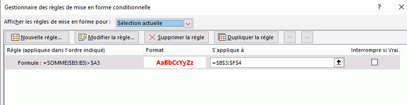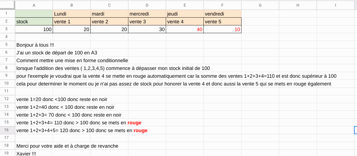 Merci tout d'abord d'avoir pris le temps de lire mon post et pour ta réponse c'est que mon exemple est sur google sheets , je suis chez moi et je n'ai pas excel ici, je voudrai adapter cet exemple à mon travail sur excel sur un tableau bien plus complexe maisqui reprend cette demande.