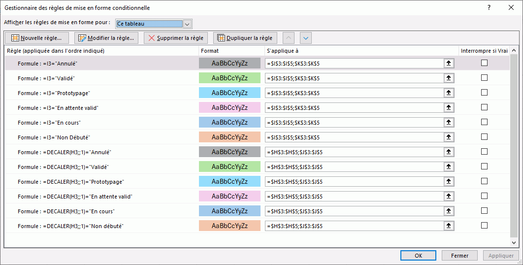 Je joins un autre fichier avec le format conditionnel appliqué jusqu'en bas du tableau, (dans le premier il n'est appliqué que dans la 1e ligne, à copier/coller sur les suivantes). Pourquoi ? Car votre tableau est très (trop?) grand, il faudrait utiliser une table ce serait plus économe en ressources. En effet les formats conditionnels peuvent vite ralentir votre classeur, et en avoir 6 par cellule * le nombre de lignes… vous imaginez l'usine à gas.