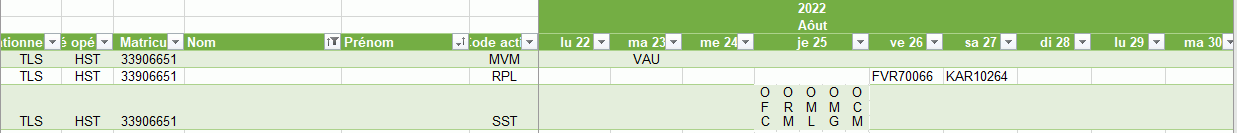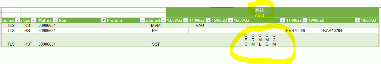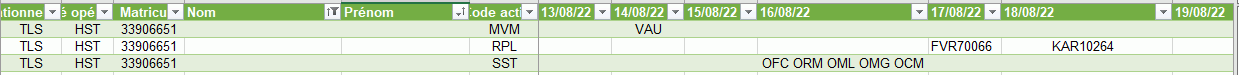 J'ai créé avec Power Query un tableau croisé qui me donne un calendrier perpétuel à droite (1 colonne = 1 jour) et 3 lignes distinctes par Matricule : MVM, RPL et SST (le nom et prénom est masqué) :