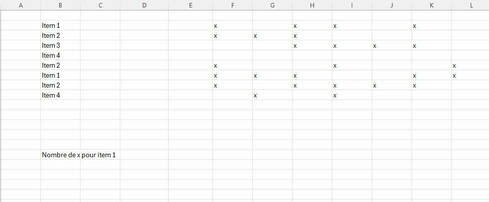 dans cet exemple, combien y a t'il de x pour l'Item 1 , quel est la formule (pour afficher le total de 9)