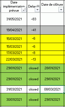 Avec de J7 à J1000 la colonne "Date d'implémentaiton" ; Avec de L7 à L1000 la colonne Date de clôture