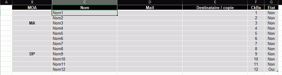Une deuxième amélioration souhaitée, j'ai renseigné le RowSource da ma listBox, comment faire pour l'alimenter de C2 à dernière ligne non vide car la liste des noms peut être évolutive, j'ai essayé des bouts de codes mais cela n'a jamais été compatible avec mon histoire de caption checkBox.