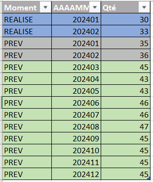 - Qté réelle vendue =CALCULATE(SUM(Tableau1[Qté]);FILTER(Tableau1;Tableau1[Moment]="PREV" && Tableau1[AAAAMM]>[MAX- DATE REALISE]))
