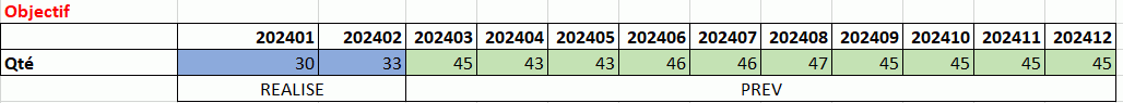 Malheureusement, j'ai l'impression que Power Pivot ne comprend cette partie de la formule dans la mesure n°3 (Tableau1[AAAAMM]>[MAX- DATE REALISE]). En effet il me calcule la somme de toute l'année du moment "PREV" alors que je voudrais qu'il me calcule seulement la somme des qtés à partir du mois de mars et ceux jusqu'au mois de décembre (Janv et fev étant réalisé). Pourtant lorsque j'affiche dans un TCD le résultat de la mesure MAX - DATE REALISE, je trouve bien 202402. De plus Power Pivot n'indique pas d'erreur dans la formule.