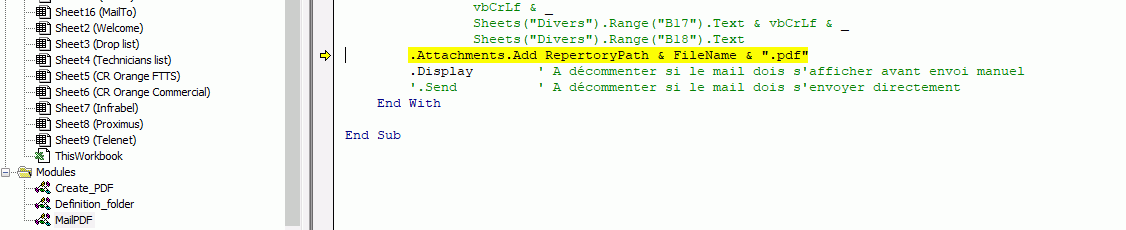 Problème avec envoie de mail Le 13/10/2023 à 08:18Heavy_BMembre fidèleMessages271Excel365 EN + onlineInscrit06/07/2021EmploiTélécom Bonjour le forum,sur ce fichier j'ai un soucis au niveau de l'envoie du mail que je n'arrive pas à résoudre, quelqu'un aurais-il l'amabilité d'y regarder svp.J'ai un message d'erreur qui apparait : et qui pointe sur : Pour moi tout à l'air correcte car le fichier est bien en place : 13saf-template.zip (369.69 Ko) Le 13/10/2023 à 08:55h h2so4ModérateurMessages14'216Fichiers5Excel365 EN Windows 10Tél.9'990Inscrit16/06/2013bonjour,vérifie le contenu de tes variables repertorypath et filename (ne sont pas initialisées selon ce que je vois dans le code)Le 13/10/2023 à 10:41Heavy_BMembre fidèleMessages271Excel365 EN + onlineInscrit06/07/2021EmploiTélécomBonjour h2so4,en effet, si je déclare les variable ca marche mieux...bizarre car j'ai juste repris le code d'un autre fichier tel quel en changeant juste les cibles, et mon autre fichier fonctionne parfaitement...Pas grave, résolus, merciLe 13/10/2023 à 10:57h h2so4ModérateurMessages14'216Fichiers5Excel365 EN Windows 10Tél.9'990Inscrit16/06/2013bonjour,une info sur la déclaration des variables et leur visibilité par les autres modules et procédures.déclaration de variablesLe 13/10/2023 à 12:02Heavy_BMembre fidèleMessages271Excel365 EN + onlineInscrit06/07/2021EmploiTélécom Je débute en VBA, sorry pour les bêtes questions...Grand merci pour le lien, très instructifRechercher des sujets similaires à "probleme envoie mail"ForumsExcel - VBAProblème avec envoie de mail