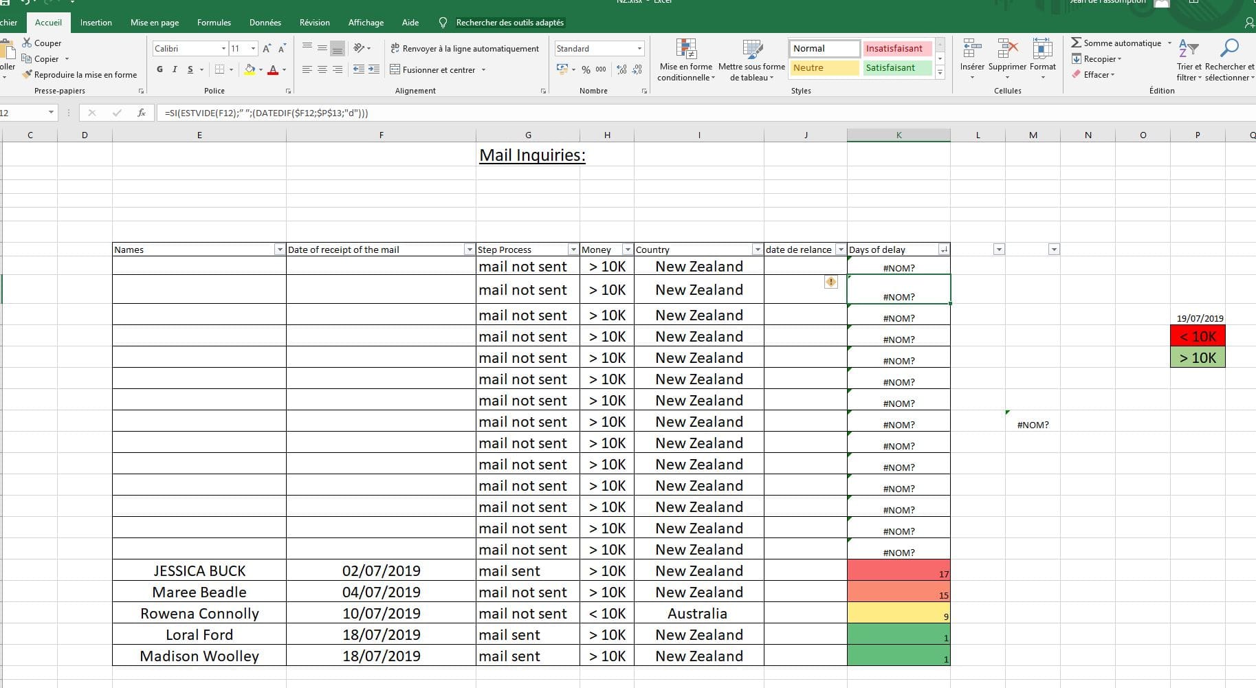 Le problème ici est dans ma colonne "days of delay" ou j'ai cette formule =SI(ESTVIDE(F12);″ ″;(DATEDIF($F12;$P$13;"d")))