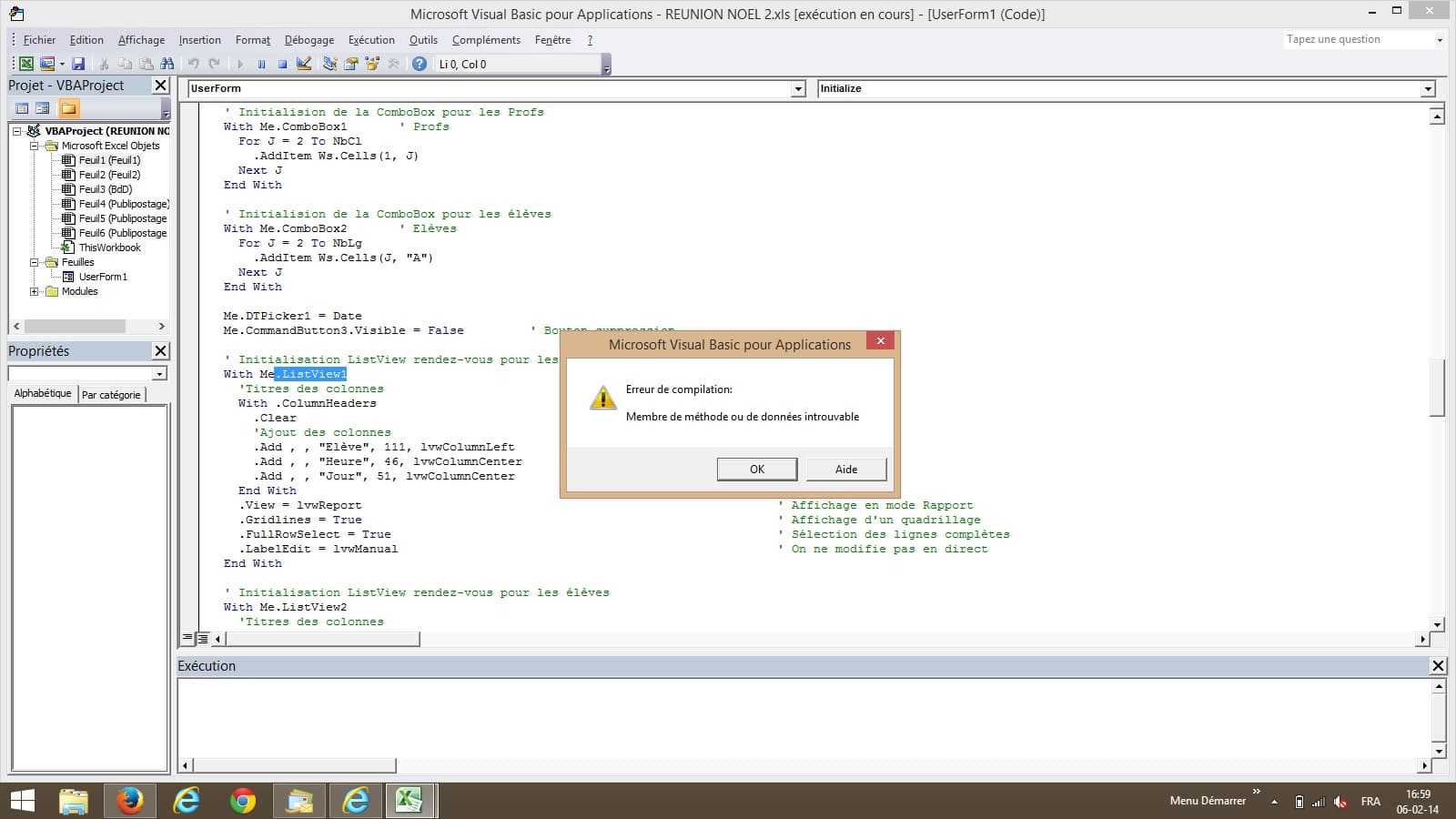 J'ai en effet su ouvrir le fichier et l'utiliser, après les petits soucis que nous avions connu, avec le pc de mon lieu de travail (sous excel 2003), et sur mon ancien pc (lui aussi sous 2003). Par contre, j'ai eu le souci du DTPicker (que j'ai résolu par les mêmes moyens énoncés au début de ce sujet), et là, j'ai un autre souci, comme on peut le voir sur l'image jointe. j'ai déjà effectué quelques recherches sur le net, en vain. Je précise, mon portable actuel tourne sous Win8 64bit, et je dispose d'excel 2010 (32 bit). Je précise aussi, mais vous l'imaginez, que c'est lorsque j'appuie sur le bouton "action", que je me retrouve face au problème.