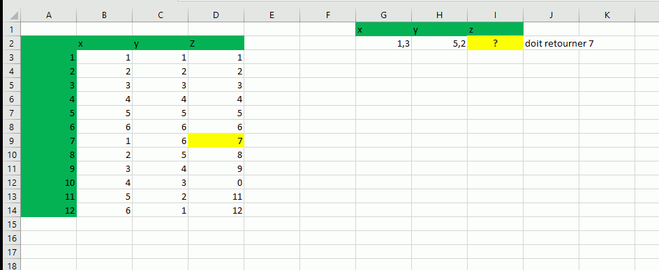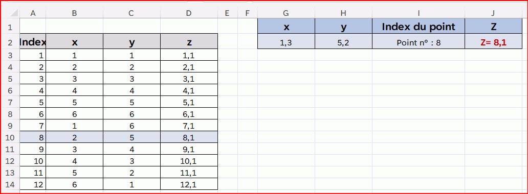 =INDEX(A3:A14;EQUIV(MIN((B3:B14-G2)^2+(C3:C14-H2)^2);(B3:B14-G2)^2+(C3:C14-H2)^2;0))