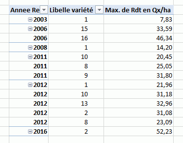 Oui c'est cela, mais je veux loger cela dans un autre tableau. J'ai 200 variétés et x contrats par variétés. Pas question de tout reporter à la main.