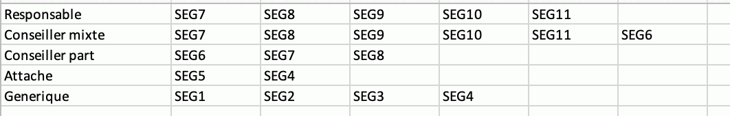 - Répartition : Liste toutes les agences avec tous les profils de métiers, le nom du vendeur, le nb de clients maximum (cumulé) que chaque vendeur peut avoir et les colonnes de segment qui, cumulés, ne peuvent dépasser "le nb de clients maximum".
