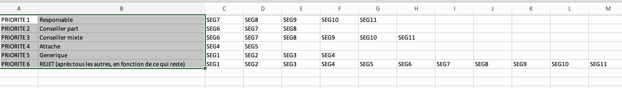 Dès qu'un vendeur a atteint le nombre de clients maxi, il passe au suivant (quand SEG commun) et.. Si ça ne passe pas, est-ce qu'il peut faire un onglet en mettant les SEG rejetés avec le nombre restant n'ayant pas été attribué ? (Je vais peut être un peu loin