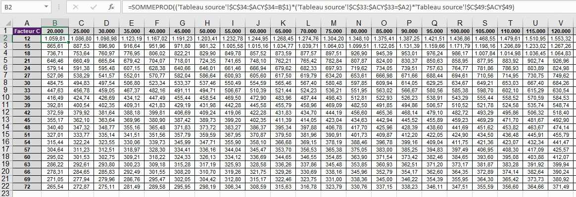 Pourriez-vous m'aider avec une formule à inscrire dans le tableau matriciel qui viendrait chercher les données (facteur C) en fonction des facteurs A et B?
