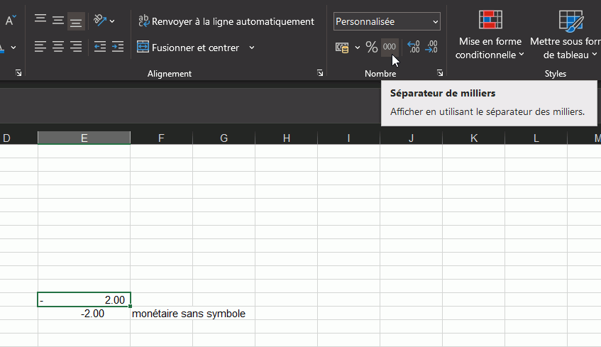 Dans mes cellules Excel, j'utilise souvent l'affiche des chiffres avec la fonction "Séparateur de milliers". (000) dans les outils "Nombre".