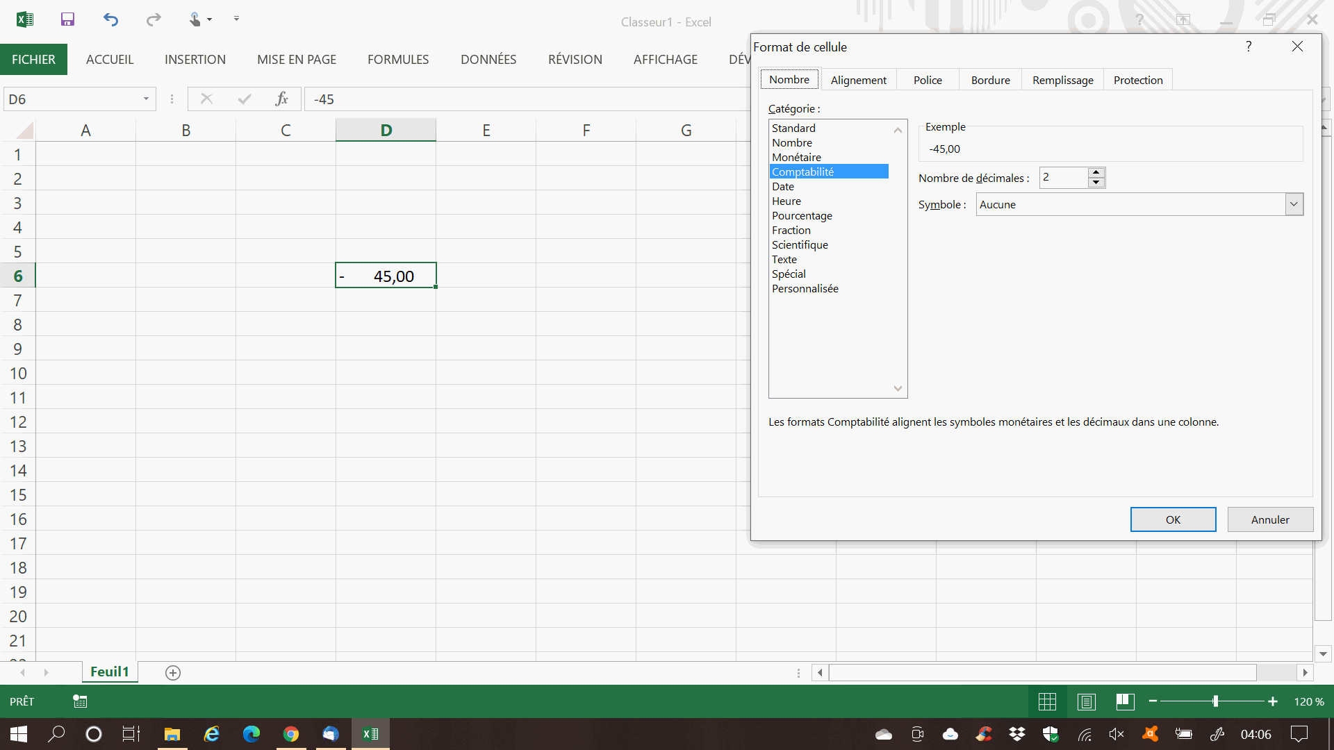 Avec le signe "moins" justifié tout à gauche de la cellule.