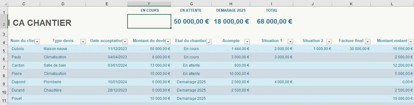 =SOMME(FILTRE(OrdresDe_travail[Montant restant];(OrdresDe_travail[[Etat du chantier ]]=F$1);0))