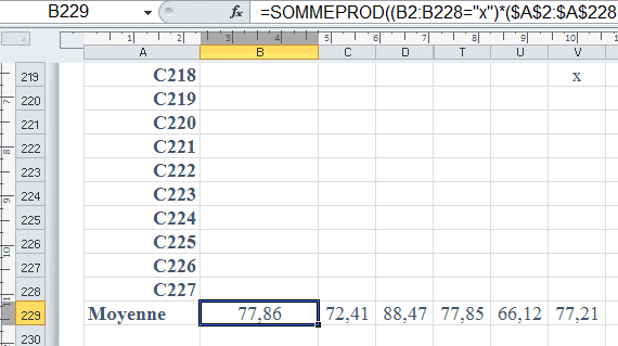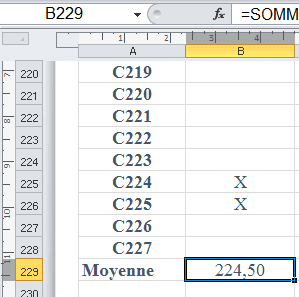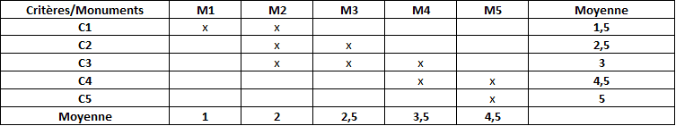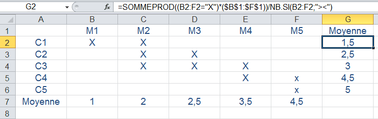 Dans le tableau, ci-joint, le classement des lignes et des colonnes se base sur le calcul d’une moyenne. Pour chaque ligne, il est nécessaire de faire la somme des numéros de colonne correspondant à chaque attestation puis, il faut diviser par le nombre total d’attestations. Le tableau présente le résultat de ces différentes moyennes mais je ne trouve pas la formule permettant d’arriver à ces résultats. En effet, j’ai essayé différentes formules mais sans succès.