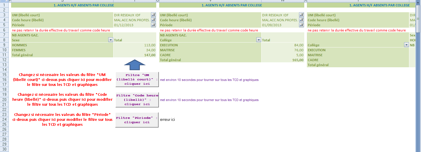 Chacun de ces TCD a trois filtres identiques sur tous les TCD, à savoir le filtre "UM (libellé court)", le filtre "Code heure (libellé)" et le filtre "Période".