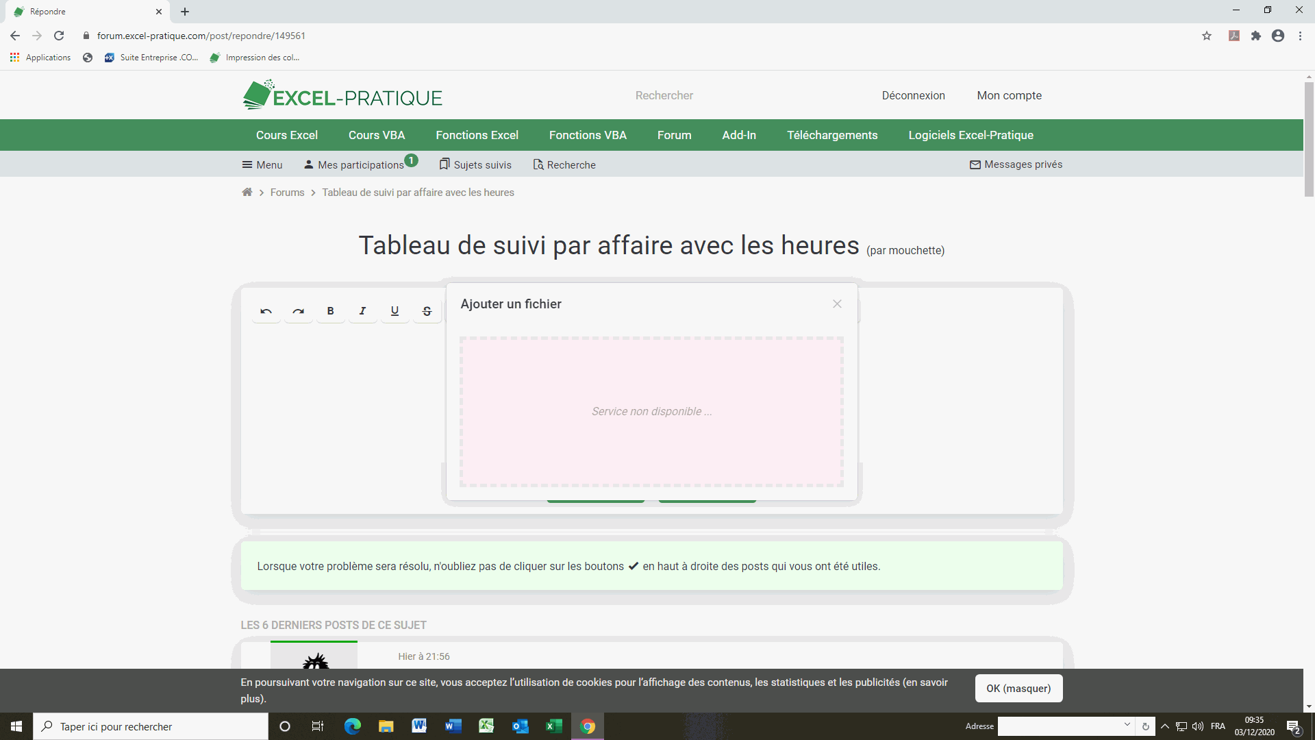C'est un peu bizarre, quand même. Sur ton image tu me montres que le service n'est pas disponible et ensuite tu as utilisé le service pour envoyer ton fichier Excel ; il est donc disponible !