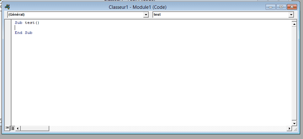lorsque je clique sur le bouton "play" pour exécuter mon code (comme je le faisais habituellement) on me demande de creer une macro, je lui donne donc le nom test et là, une nouvelle fenêtre s'ouvre