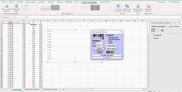 Cela m'affiche bien les données en colonnes au fur et a mesure. Cependant, j'aimerais pouvoir avoir un graphique qui se trace en temps réel avec le temps en abscisse et x y et z en ordonnées et donc obtenir 3 courbes à la fin de ma mesure. (accélérations sur ces 3 axes).