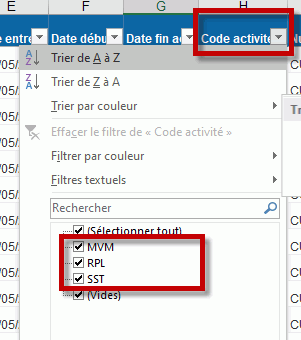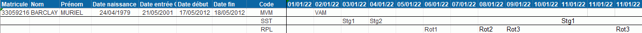- Il me faut désormais décliner ces évènements par CODE Activité. ce code prend 3 valeurs : "MVM" = visite médicales; "SST" = Stages et "RPL" = Rotations ci-dessous :