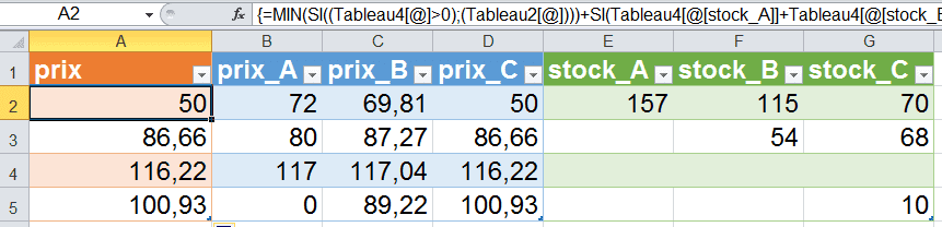 La première ligne (n°2) est très simple; il y a du stock chez tous les fournisseurs donc un petit "=MIN(B2:D2)" fera l'affaire.