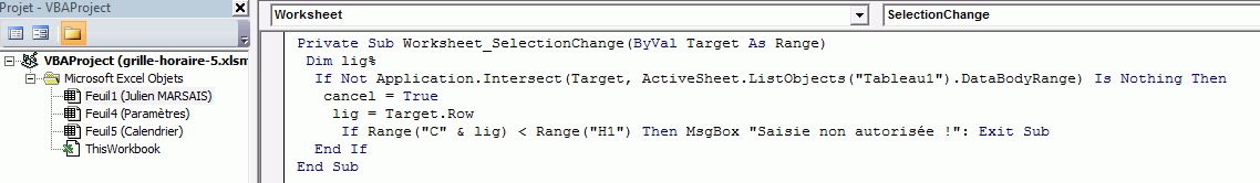 If Range("C" & lig) < Range("H1") Then MsgBox "Saisie non autorisée !": Range("G" & x).Select: Exit Sub