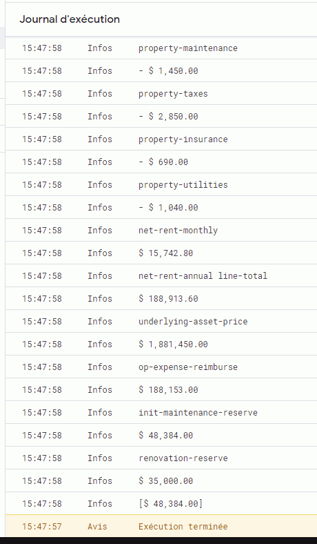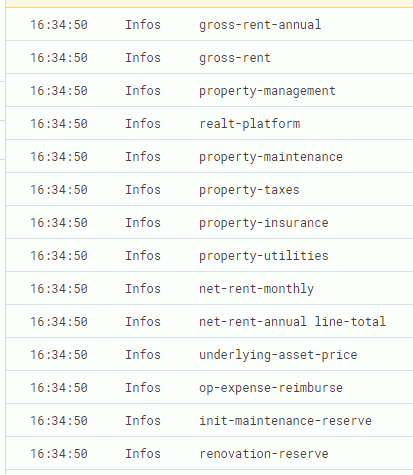Logger.log ([data.assetAnnualReturn, data.assetRentStartDate, data.assetRentPerToken, data.assetHasTenants, data.assetTokenPrice, data.assetSection8, data.assetSection8Pays])