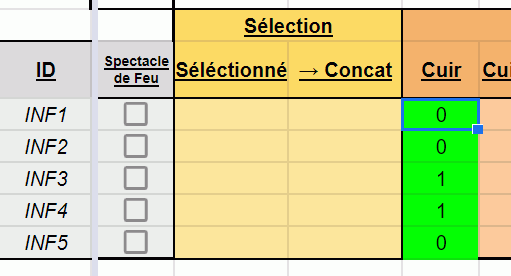 Toujours dans CUIR, colonne F, il est possible de cocher une case à cocher pour chaque item (pour le sélectionner).